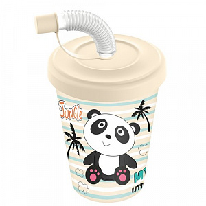 Стакан детский с крышкой, трубочкой и колпачком 280мл с декором "Панда" (светло-бежевый)