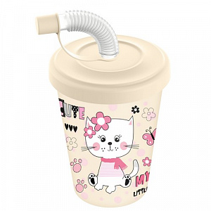 Стакан детский с крышкой, трубочкой и колпачком 280мл с декором " Кошечка" (светло-бежевый)
