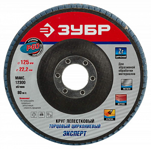 Круг шлифовальный ЗУБР "ЭКСПЕРТ" лепестковый торцевой, тип КЛТ 1, зерно-электрокорунд циркониевый, P60, 125х22,2мм