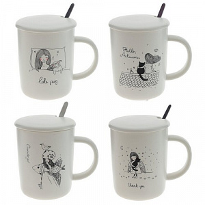 Кружка с крышкой и ложкой, 350 мл, L11,5 W8 H11 см, 4в.