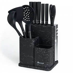 НАБОР AGNESS ИЗ 11ПР:5 НОЖЕЙ,ПОЛОВНИК,ЛОПАТКА,ШУМОВКА,ПОДСТАВКА,НОЖЕТОЧКА,НОЖНИЦЫ,ЧЕРНЫЙ МРАМОР/СЕРЫ