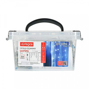 VEGAS 24V Электрогирлянда "Бахрома" 72 синих LED ламп, 18 нитей, в боксе, прозр провод, 3*0,6 м, с блоком питания, удлиняемая