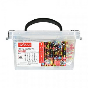 VEGAS 24V Электрогирлянда "Занавес" 96 разноцветных LED ламп, 6 нитей, в боксе,прозр провод, 1*2 м, с блоком питания, удлиняемая