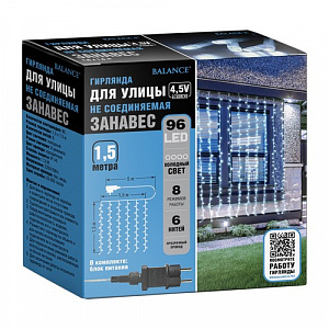 BALANCE 4,5V Электрогирлянда "Занавес" 96 холодных LED ламп, прозр провод, 6 нитей, 1,5*1,5 м, 8 режимов, с блоком питания